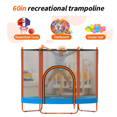 The Ativafit 60" trampoline features a 39-inch high-enclosure safety net, 36 high-quality springs, premium alloy steel construction, integrated spring and pad design, and includes multiple accessories (dartboard, basketball hoop, ocean balls) for enhanced play value.