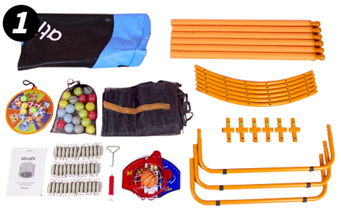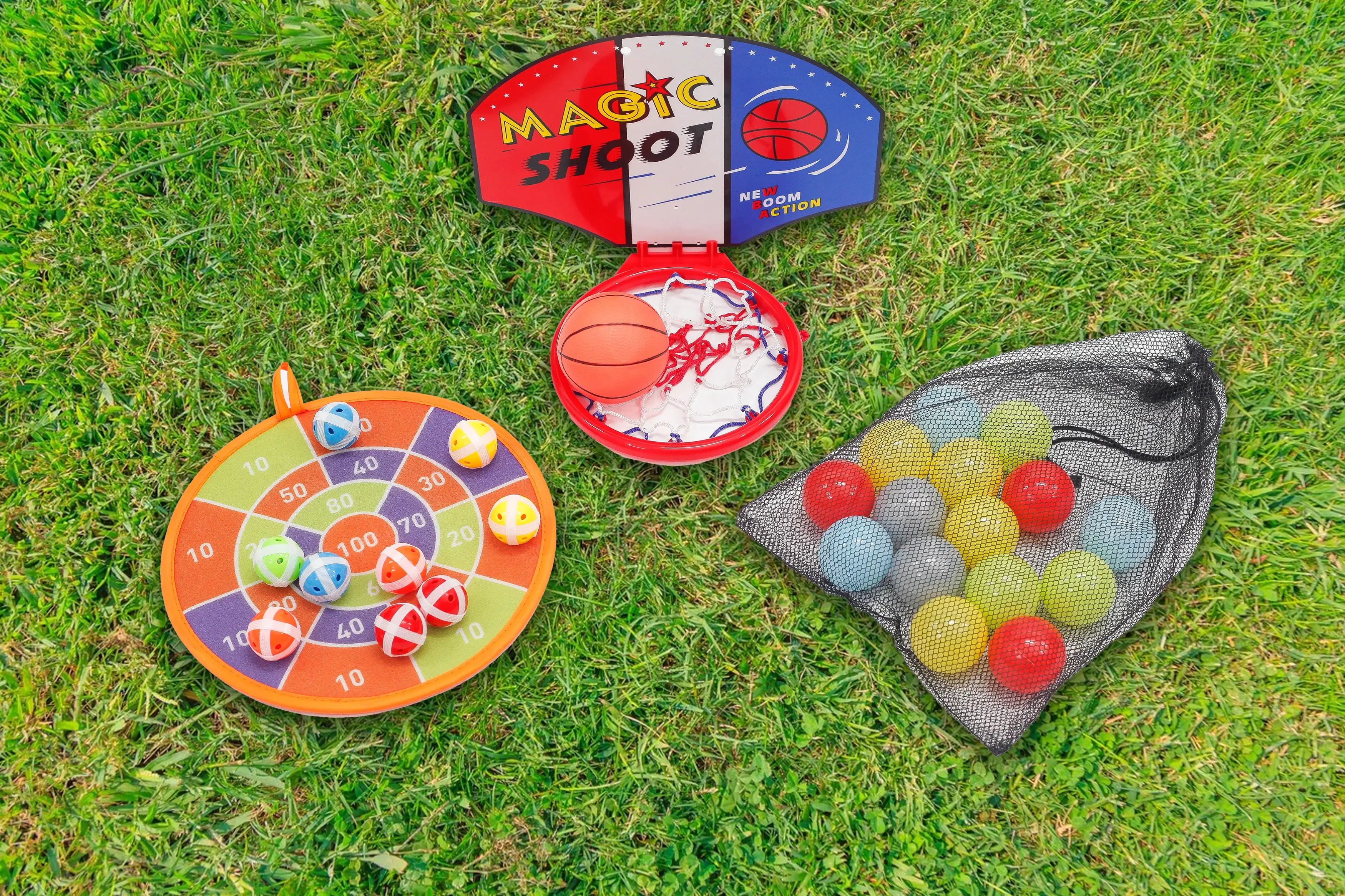 - Custom dartboard with 10 balls- High-quality basketball hoop + 1 ball suitable for one-handed grip by kids- 20 ocean balls + special storage net bag