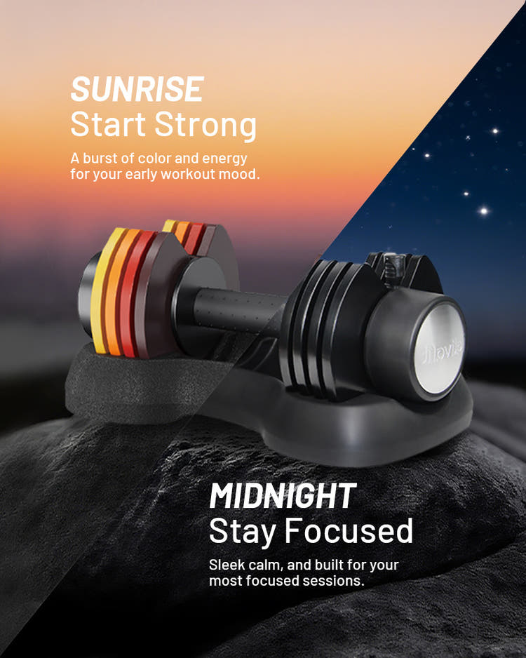 Say goodbye to cold, industrial equipment. With "Sunrise" & "Midnight" colorways, the Spark Ativafit adjustable dumbbell set is a stylish piece of your home decor.