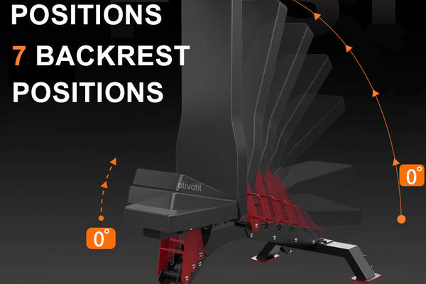 The bench features 7 backrest positions and 3 seat positions, allowing for a full range of angles to suit various exercises.
